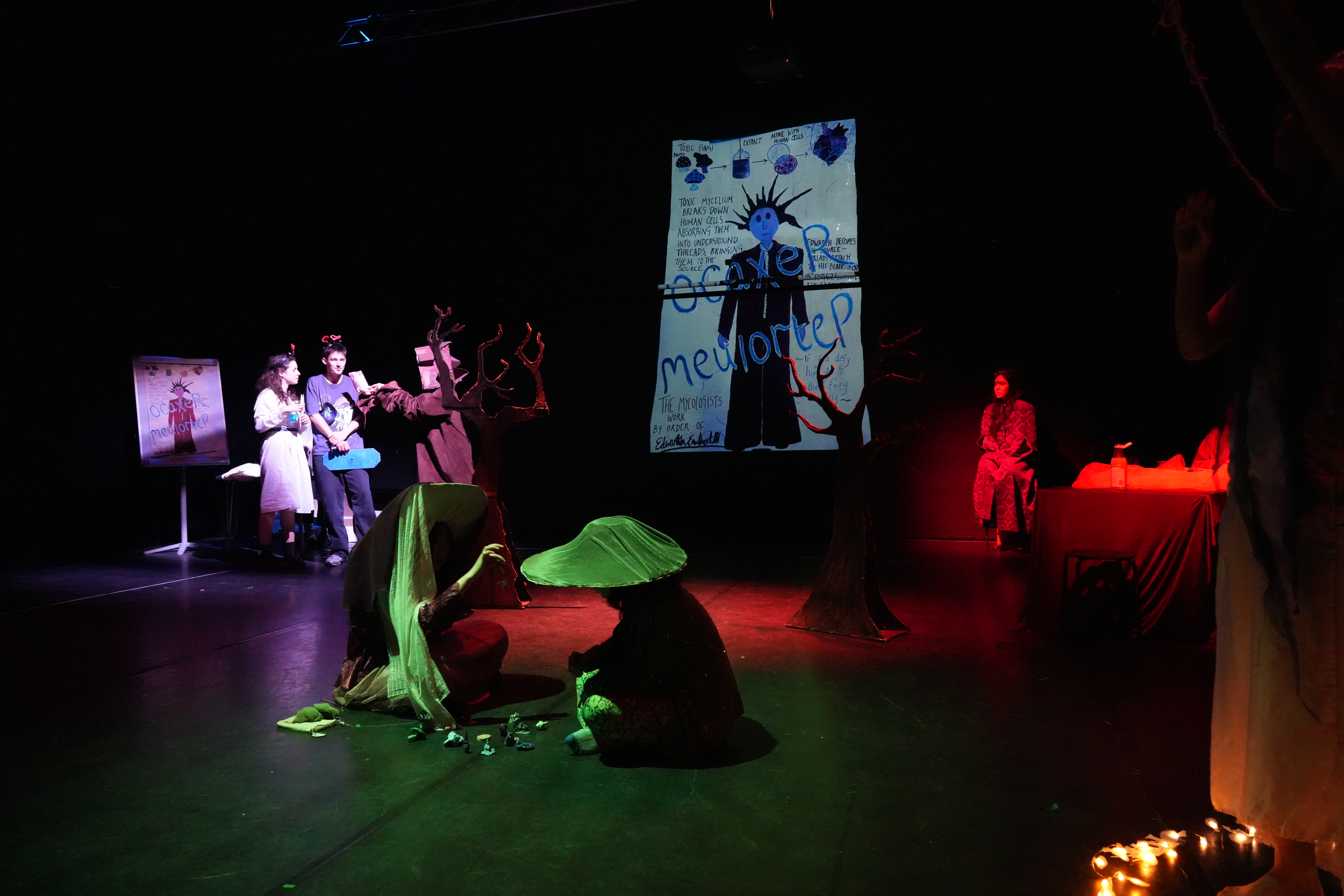 The first work produced from my Mycelium oil polluted research was ‘Forage’ A scenic installation. Here I began to develop ideas for the settings of a mushroom laboratory filled with corruption, inspired by a ‘Charlie in the chocolate factory’ -esque journey through rooms. Each scene was paired with a QR code for soundscape and poetry. Each had an interactive moment.