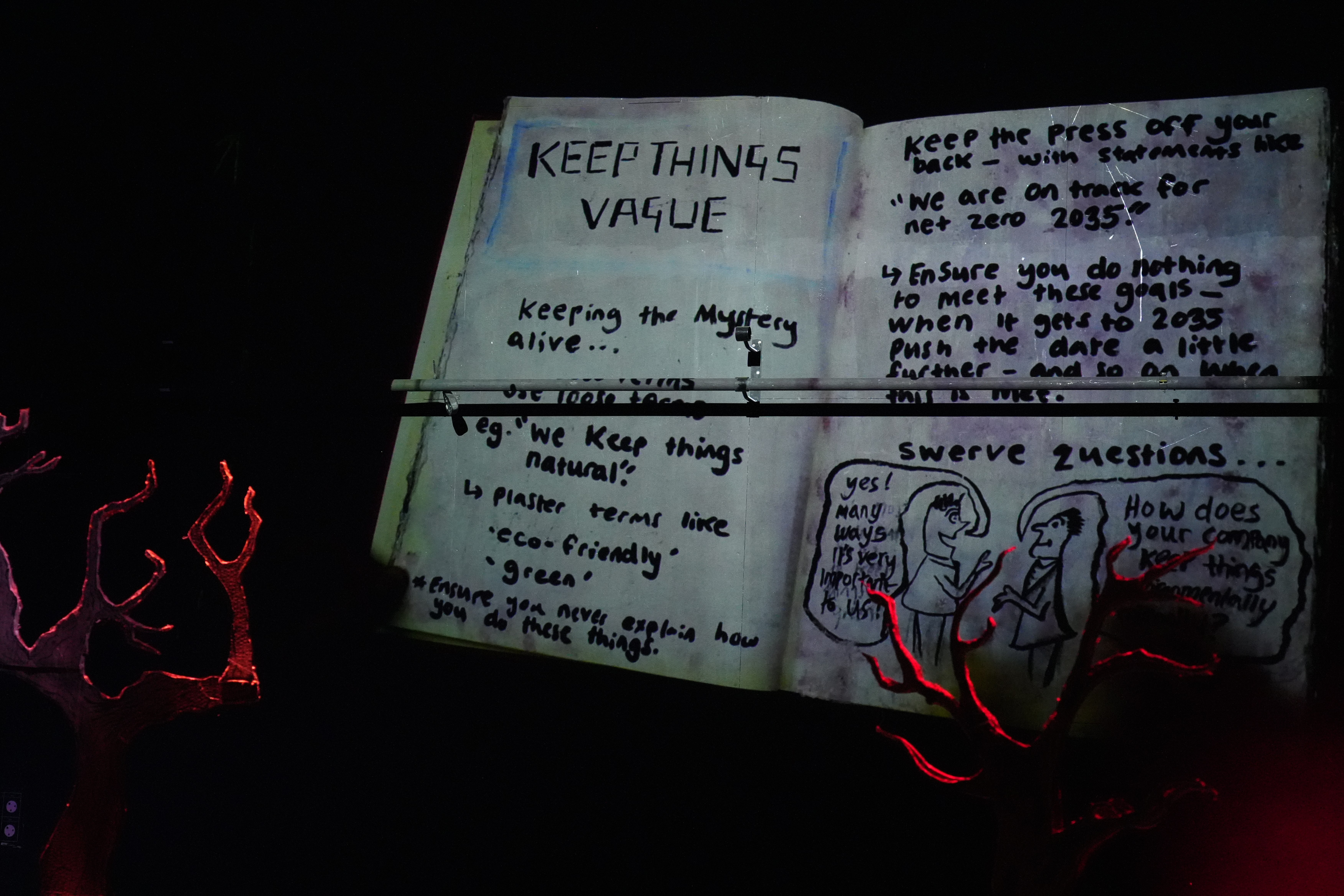 False Morels utilises a satirical tone and video game style choice making to bring to light the environmental impacts caused by oil companies. Through an immersive experience participants can understand the narrative through personal contact with objects, moving image, soundscape and characters.